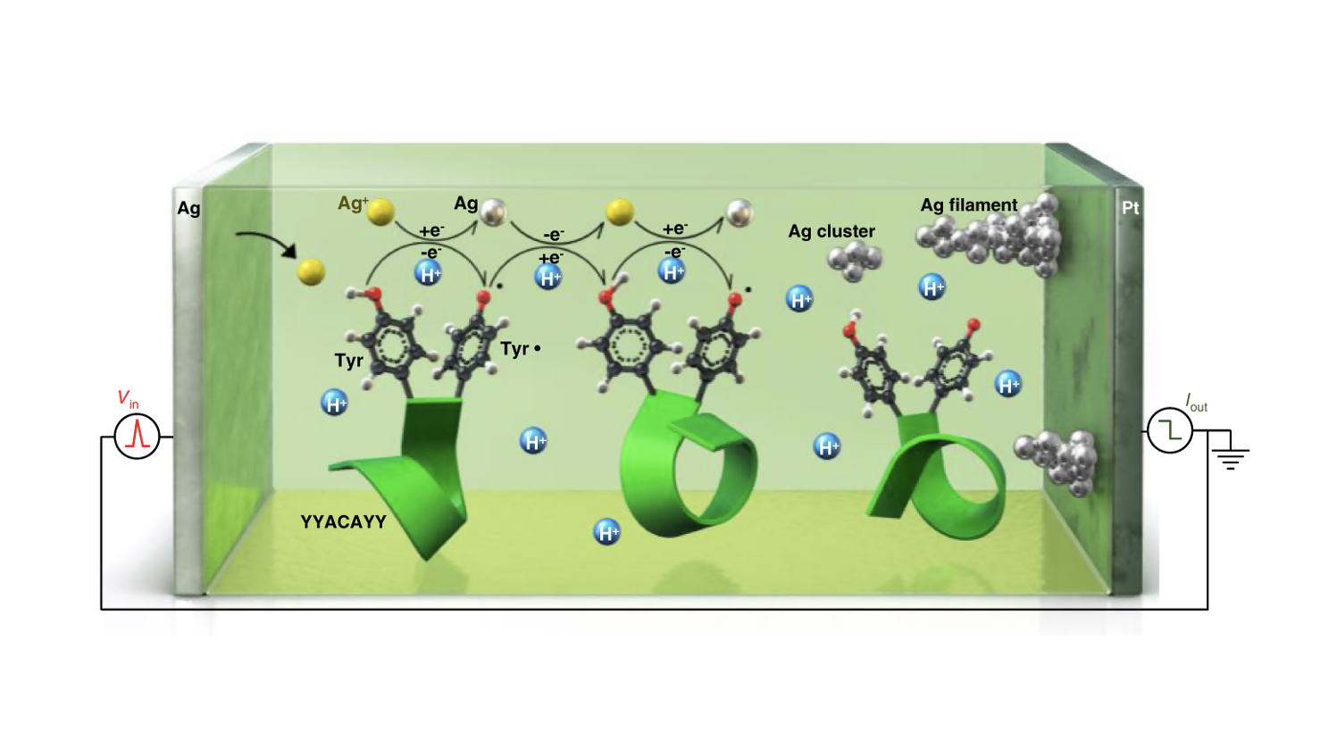 We developed the first biomodal neuromorphic device that operates using both electrons and protons, based on 2D peptide assemblies incorporating redox-active tyrosine residues—mimicking photosynthetic charge transport in nature.
